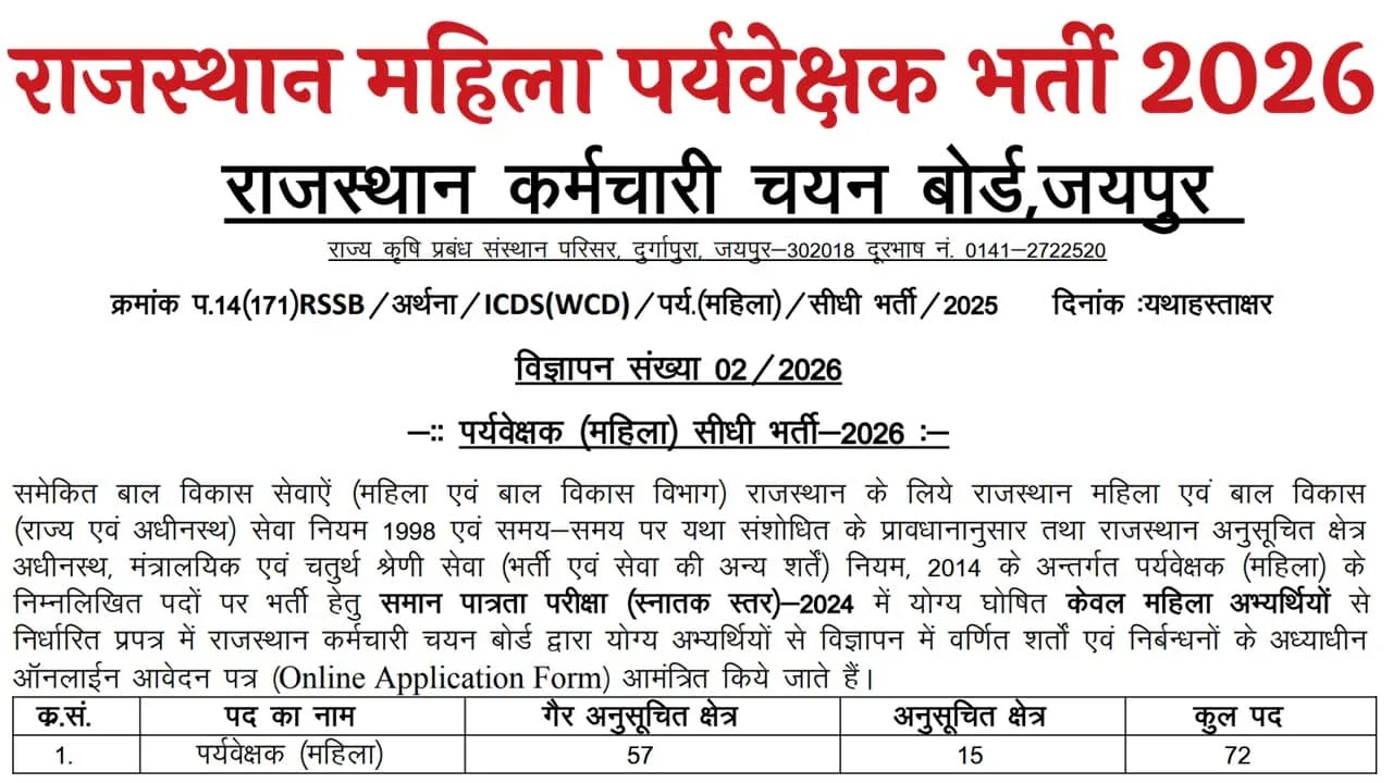 Rajasthan Woman Supervisor Recruitment 2026: राजस्थान में महिला पर्यवेक्षक के 72 पदों पर नियुक्ति के लिए अधिसूचना जारी